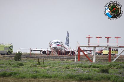 Sukhoi Superjet 100 performs gear up landing at Keflavik, Iceland