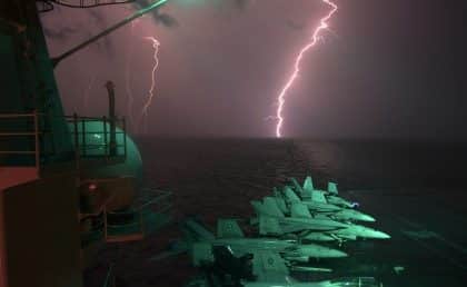 Perfect Storm: Lightning flashes as U.S. aircraft carrier passes through a thunderstorm