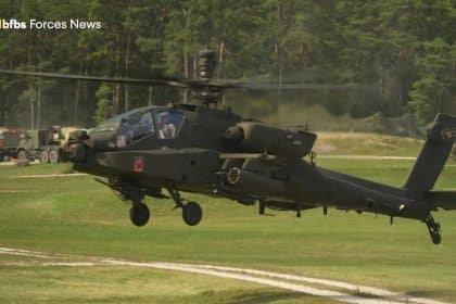 U.S. and British Armyโs AH-64E Apache Helicopters Fly Together for the First Time in Exercise Saber Junction