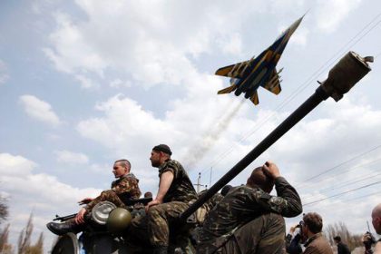 Ukrainian MiG-29 Fulcrum (in display team livery) performs low pass over pro-Russia separatists